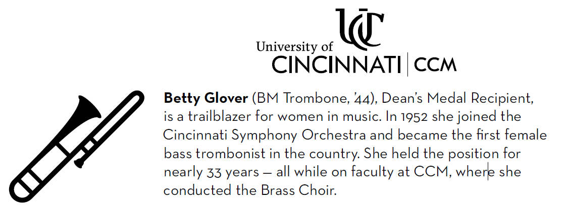 Piano, voice, and euphonium were her strong suits. The trombone was low on her interest list until college, when she transfered to UC to study with Ernest Glover.